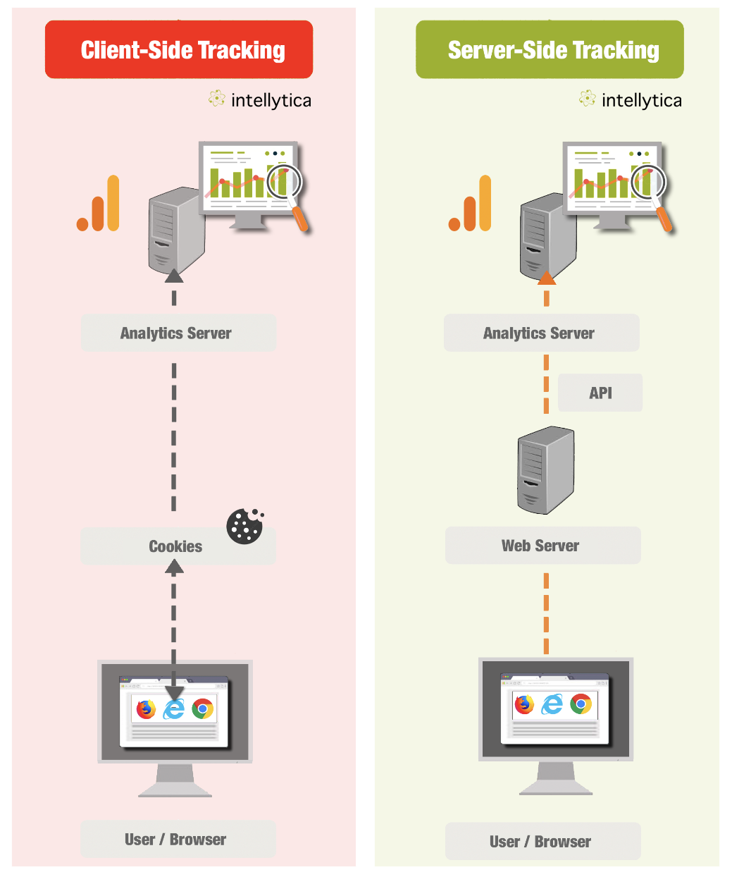 Das Server-Side Tracking grenzt sich damit vom bisherigen Vorgehen ab, dem so genannten Client Side Tracking. Beim Client Side Tracking wird die Nutzerinteraktion auf der Website oder App nämlich aus dem Browser des Nutzers an die Analysetools des Drittanbieters gesendet.